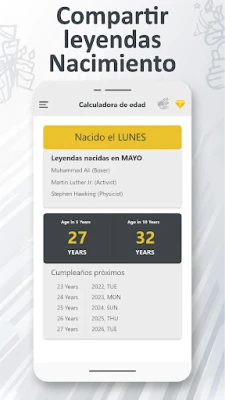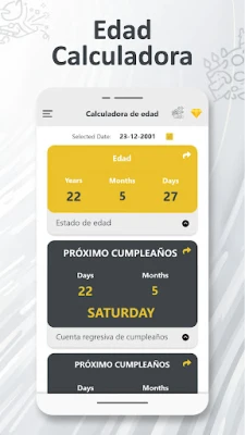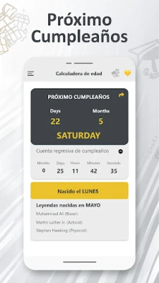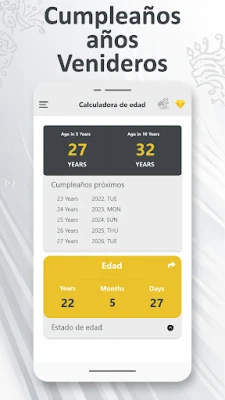 Diseñada con una interfaz de usuario intuitiva y despejada, la experiencia con esta herramienta es siempre fluida y sin complicaciones. Olvídate de cálculos manuales o de la frustración de olvidar fechas cruciales; la **calcula tu edad rápidamente** es tu solución definitiva. Y si deseas compartir con tus amigos la precisión de tu edad o cuánto falta para tu próximo festejo, la aplicación facilita la difusión de estos detalles a través de tus plataformas sociales favoritas. Con esta **aplicación de cuenta atrás de cumpleaños**, cada fecha se convierte en un evento anticipado con alegría y sin estrés.