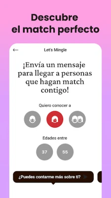 Explorar y conectar es sumamente sencillo. Desde el momento de tu registro gratuito, DateMyAge te permite personalizar tu perfil y afinar tus búsquedas para encontrar esas almas afines. Sumérgete en perfiles detallados y fotos de alta calidad, y mantente al tanto con notificaciones de mensajes. Para una interacción más profunda, las funciones premium abren un abanico de posibilidades: desde conversaciones instantáneas y videochats para una conexión más auténtica, hasta el intercambio de fotos y el envío de regalos virtuales para enriquecer tus lazos, además de la opción "Let's Mingle" para ampliar tu círculo de contactos con facilidad.
