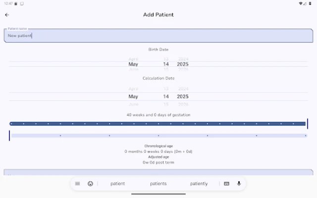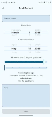 Esta aplicación ha sido meticulosamente desarrollada pensando en la claridad y la facilidad de uso. Obtén cálculos automáticos y precisos de la edad corregida y postmenstrual, visualizados de una forma sencilla y comprensible. Su interfaz amigable está optimizada para el uso cotidiano, permitiéndote registrar y acceder a la información clave de tu bebé en cualquier momento, con la ventaja de funcionar completamente sin necesidad de conexión a internet.