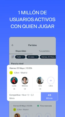 Descubre una comunidad vibrante donde el pádel cobra vida. Playtomic te conecta con entusiastas afines, ya sea para reunir a tu grupo habitual o para ampliar tu círculo de juego con nuevos compañeros de tu club o de otros cercanos. Explora perfiles de jugadores, sigue a quienes te inspiren y recibe sugerencias personalizadas para encontrar la pareja perfecta o el próximo reto. La interacción es clave en Playtomic, con funciones de chat que te permiten coordinar con facilidad y seguir de cerca la evolución y el rendimiento de tus compañeros. Aquí, el pádel es más que un deporte; es una experiencia social inolvidable.
