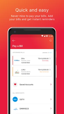 La seguridad es primordial. Por ello, la aplicación de Diamond Trust Bank Tanzania Limited le permite autorizar todas sus transacciones con la tranquilidad de un PIN de cuatro dígitos o, para dispositivos compatibles, mediante una autenticación biométrica de huella dactilar. Manténgase al tanto de sus obligaciones con la presentación anticipada de facturas de servicios, hasta cinco días antes de su vencimiento. Además, acceda a una amplia gama de servicios como transferencias de fondos a otros bancos a través de TISS, la compra de tiempo aire y el envío de dinero móvil a beneficiarios seleccionados directamente desde su agenda telefónica, todo ello mientras personaliza su perfil con una imagen de su elección.