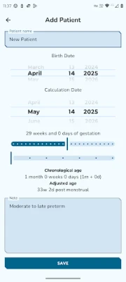 Esta aplicación ha sido meticulosamente desarrollada pensando en la claridad y la facilidad de uso. Obtén cálculos automáticos y precisos de la edad corregida y postmenstrual, visualizados de una forma sencilla y comprensible. Su interfaz amigable está optimizada para el uso cotidiano, permitiéndote registrar y acceder a la información clave de tu bebé en cualquier momento, con la ventaja de funcionar completamente sin necesidad de conexión a internet.